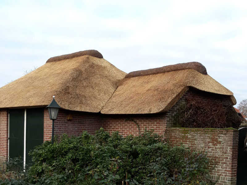 De garage bij onze eigen woning en werf in Asten was toe aan een nieuwe (uiteraard rieten) dakbedekking. Dit tweelingdak was een mooie uitdaging om ons vakmanschap te laten zien. Normaal werken we onze daken af met vorstpannen, bij dit dak hebben we gekozen voor een heidevorst. Een type vorst wat in Zuid-Nederland niet zo vaak voorkomt, maar in het oosten van het land wel en ook veel in Duitsland.